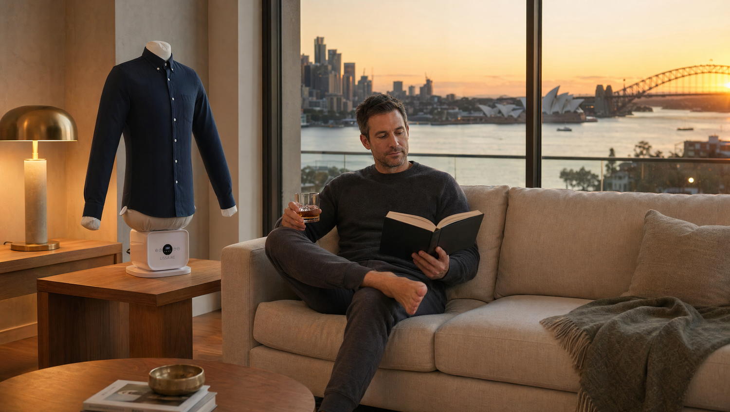 Lissaire is the automatic ironing machine that presses dress shirts, blouses, and polos while you rest. Fits S to XXL+, collapses smaller than an ironing board.